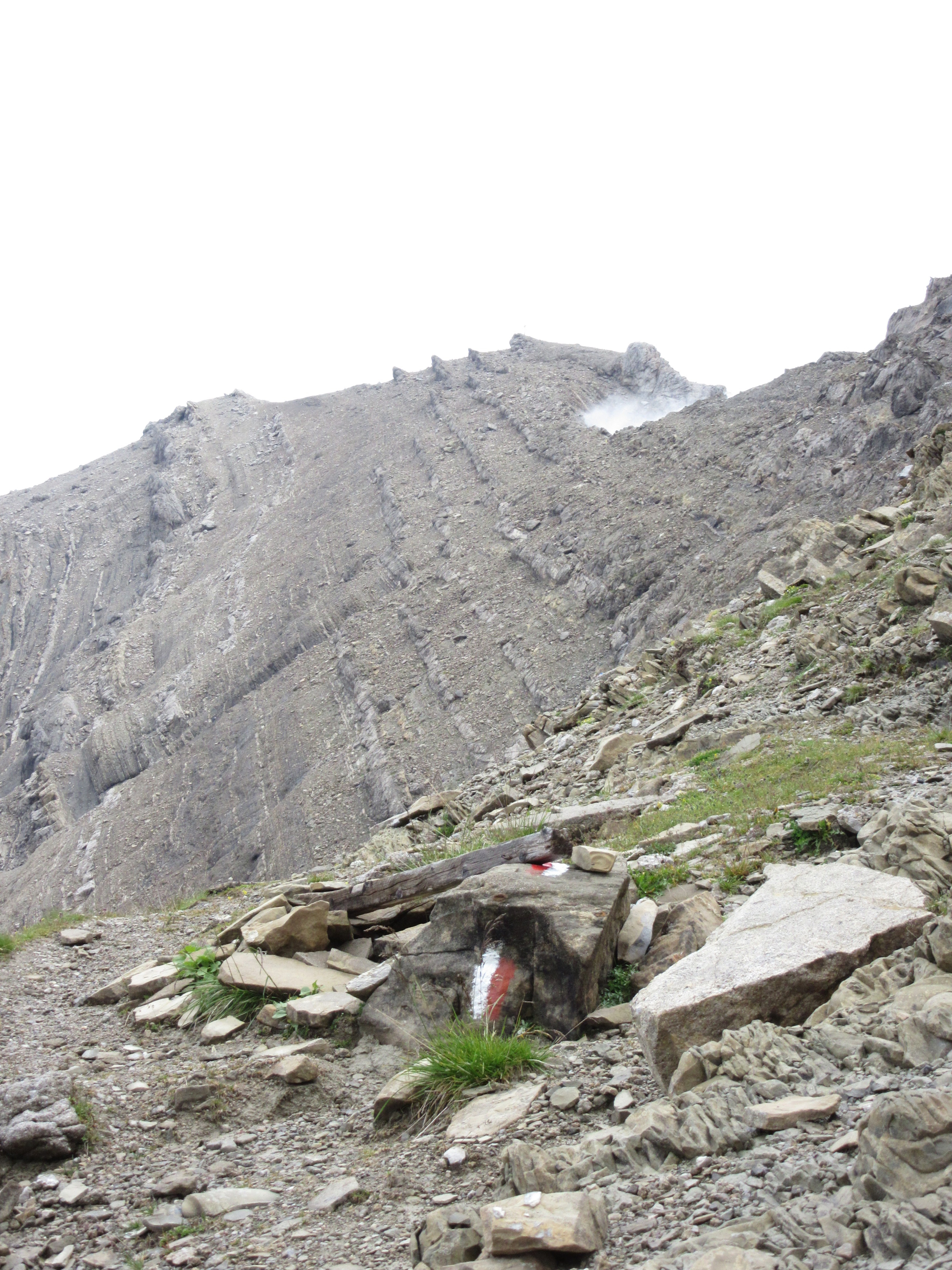 Nach den Kübelwänden fanden wir uns auf einem lieblichen Boden wieder mit einer Schafherde die neugierig zu uns blickte. Der Regen hörte auch irgendwann dauerhaft auf. Von der Fundaisalpe ging es wieder steiler am Wiesengrat entlang bis man ein Schuttband zum Galtseitenjoch querte. Dort trafen wir auch das einzige Mal heute Wanderer in die Gegenrichtung.